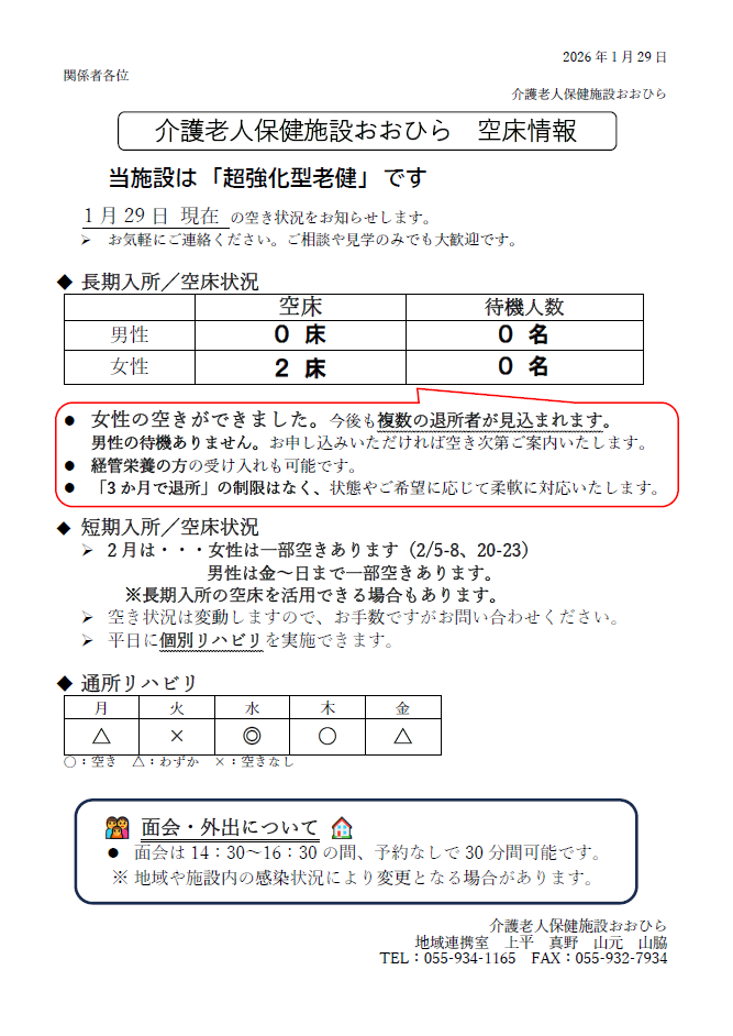 2026.01.29 空き状況のお知らせ(更新1月29日) Instagram(通所):https://www.instagram.com/oohiradc Instagram(おおひら):https://www.instagram.com/sykoohira 一覧へ戻る 次へ